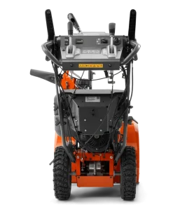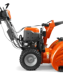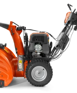 Heavy-duty auger and impeller fan churn through frozen or wet snow with a two-stage clearing system