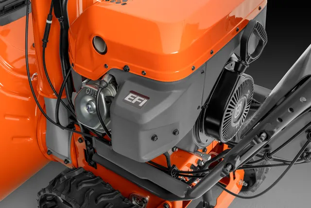 Heavy-duty auger and impeller fan churn through frozen or wet snow with a two-stage clearing system